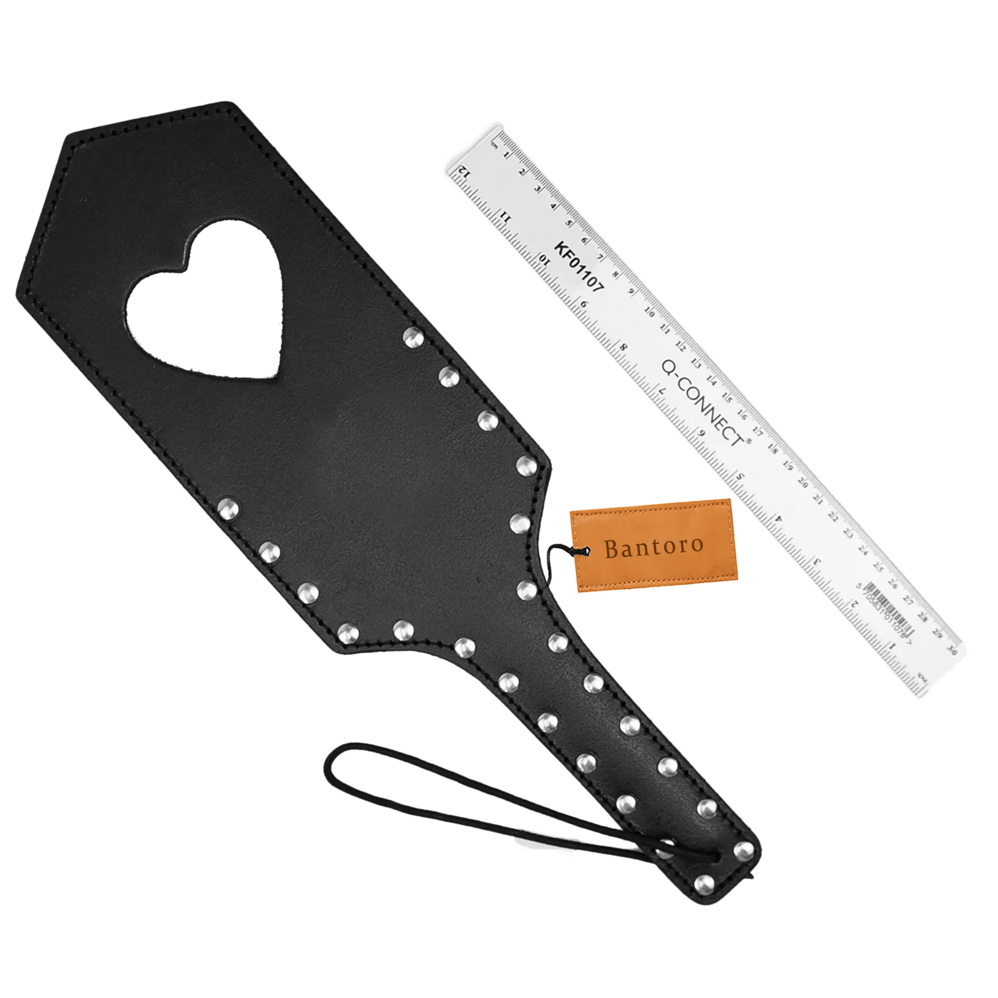 Black Leather BDSM Paddle – Heart Cut-Out & Metal Stud Handle